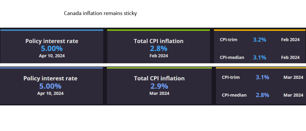 But inflation is sending mixed messages. Headline CPI increased from 2.8% in February to 2.9% in March, while the BoC ‘s preferred metrics, CPI Trim and CPI Median were lower. CPI Trim saw a modest decrease, indicating that more extreme price changes are stabilizing, whereas the CPI Median fell more significantly, suggesting that the broader inflationary pressures might be easing.