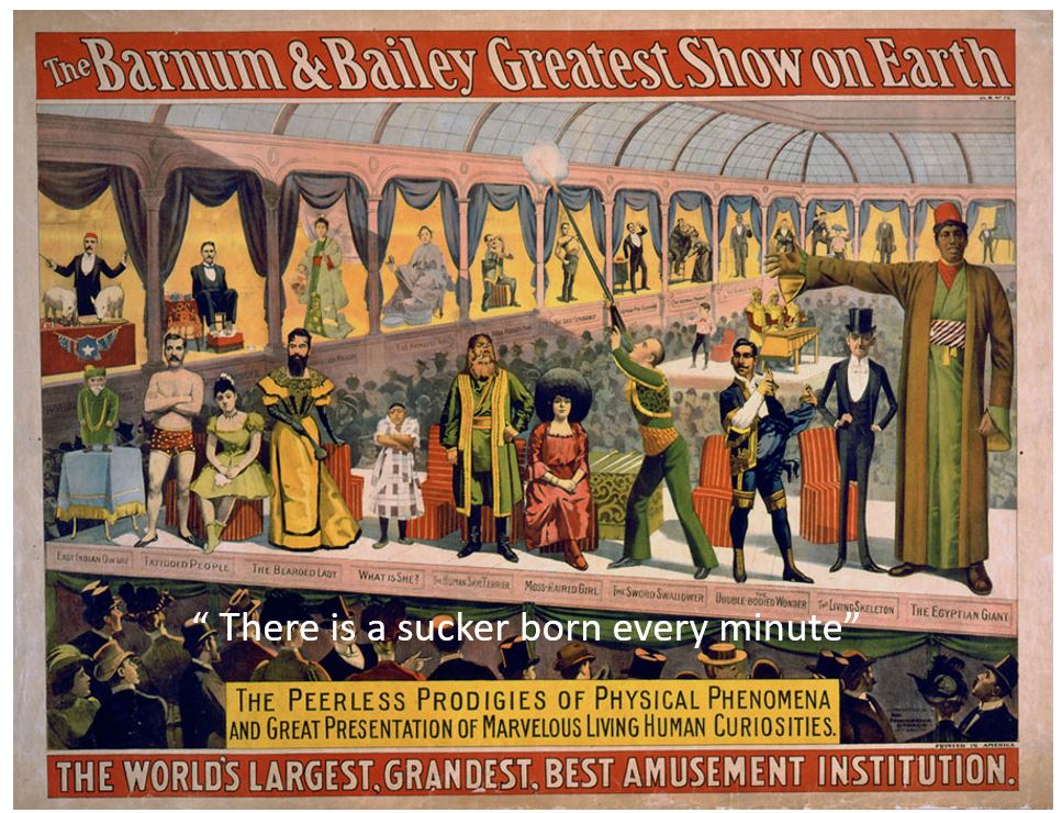 P.T Barnum was an American 19th-century super-star, a pop-culture icon, similar to pop-idols today. He was a master showman, who created a successful entertainment empire using gimmicks, gadgets, and hoaxes to attract visitors to his museums and circuses. He reportedly attributed his success to: “There is a sucker born every minute.”