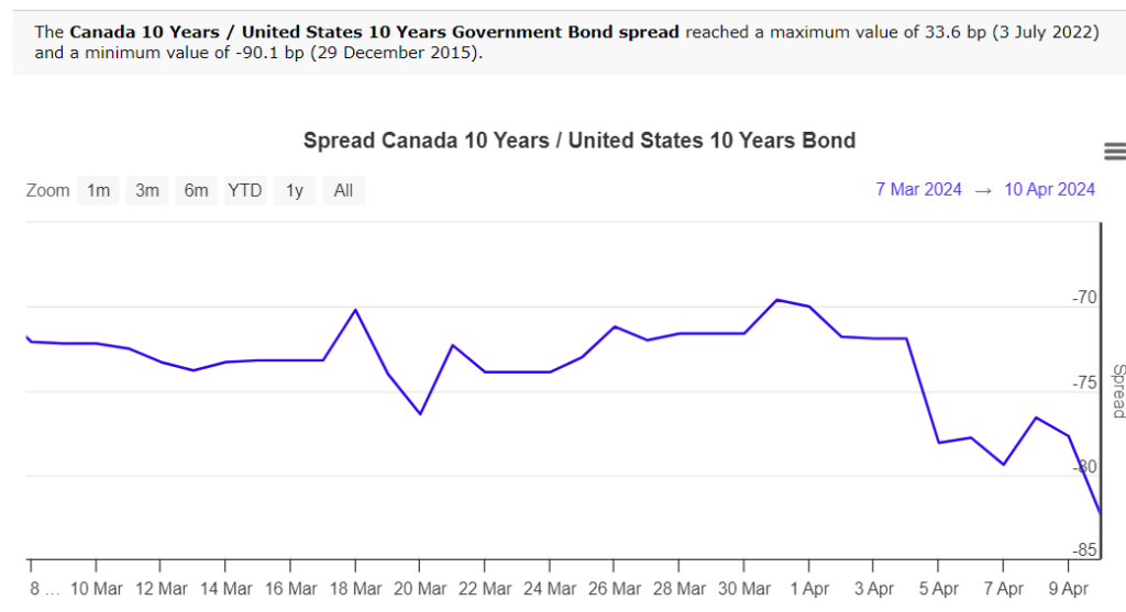 Economists at CIBC and RBC expect the BoC to cut rates in June due to Canada’s economic underperformance against the US, and because, in his press conference, Mr. Macklem, when asked about a June cut, said, “It is within the realm of possibilities.” He also injected a note of caution when he noted “We are seeing what we need to see, but we need to see it for longer to be confident that progress toward price stability will be sustained. The further decline we’ve seen in core inflation is very recent. We need to be assured this is not just a temporary dip.”