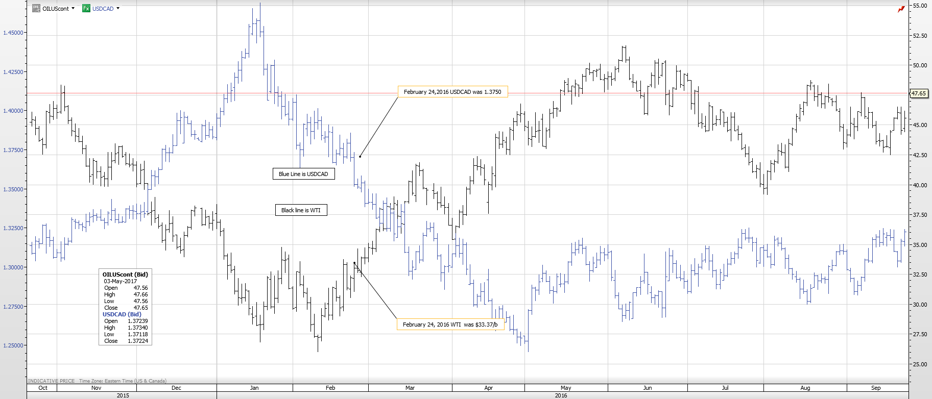 And speaking of oil, the last time USDCAD was at 1.3750, West Texas Intermediate oil (WTI) was at $33.37/barrel. (February 2016)