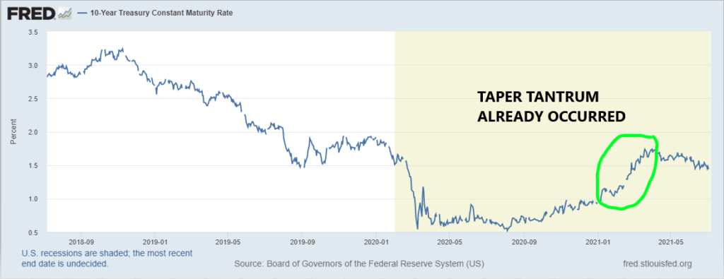 Treasury yields rose from 1.02% in February to 1.74% in April after Fed Chair Powell indicated that the FOMC would allow inflation to run hot. The pace of US vaccines was starting to pick up, and traders feared the Fed’s promise to keep interest rates super-low, would send consumer prices soaring. Yields consolidated the gains in a 1.42%-1.58% band during June.
