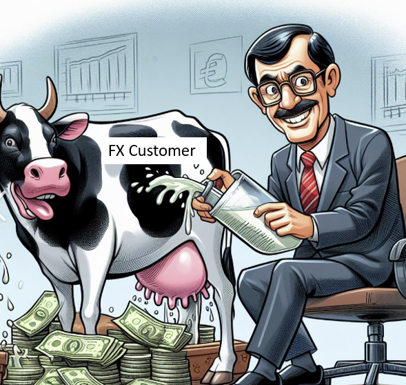 Foreign Exchange is a cash-cow business for the global banks. The worlds top 10 FX trading banks control about 68% of the entire FX daily volume and they make upwards of a combined $40 billion/year in FX profits. The bankers collect the cash while small to medium sized business and retail clients are the cows being milked. These people pay spreads from as little as 0.0001 to 0.350 points at the whim of a sales person. Can you say “moo?”