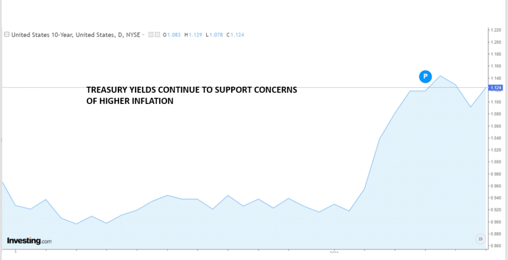 And just in case financial markets did not get the message, Fed Chair Jerome Powell said Thursday; “the time to raise rates is no time soon.” Then he reminded traders that the Fed was well armed with tools to combat rising inflation. Despite the comments, 10-year Treasury yields were sitting at 1.13% near the close of trading, Thursday.