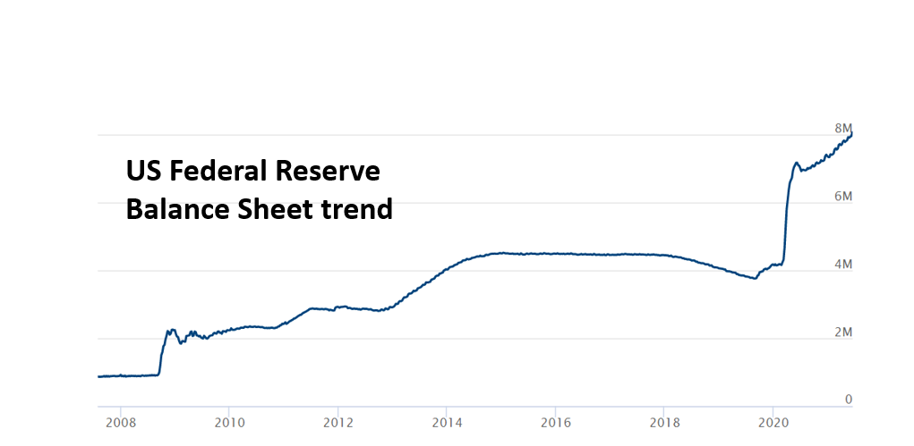 The market reaction to the mere thought of tapering is overdone. The Fed has not even started tapering discussions. It has taken the Fed over 33 months to pump in the additional $4.0 trillion of liquidity since January 2020. Tapering implies a reduction in purchases, and even if they reduced the existing QE program by 30%, it would take over 5/12 years to reach the pre-pandemic balance sheet level.
