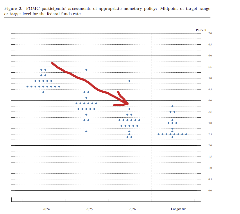 The Fed left interest rates unchanged as was universally expected but traders were sandbagged by the Summary of Projections dot-plot. The dots indicated officials were still looking for three rate cuts in 2024, the exact same as they did in December.