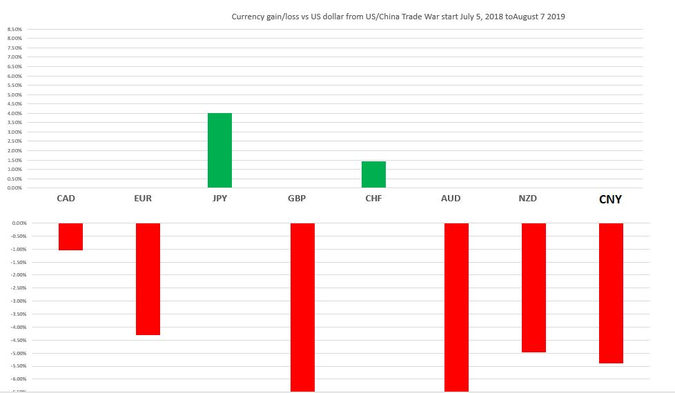 The trade war began on July 5, 2018, when both sides exchanged identical tariff amounts on imports.  Since then, the Chinese yuan (Renminbi) has lost 5.4% of its value, as at the New York open on August 7, 2019.  The currency that devalued the most was the Australian dollar.  It dropped 8.78%, a more significant move than even the British pound which is dealing with the peril around a “no-deal” Brexit. The Euro dropped 4.3% while the Canadian dollar is only down 1.04%. If China is manipulating its currency, it isn’t doing a very good job,