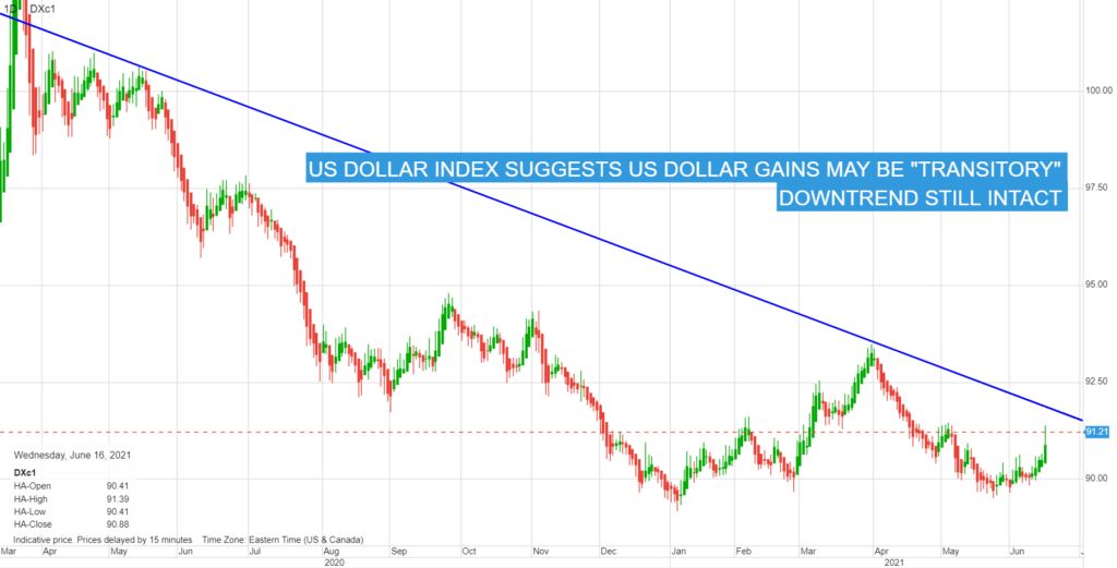 The medium forecast of two rate hikes in 2023 is a hawkish shift as there were zero hikes predicted in the March SEP.  However, Mr Powell dismisses the dot-plot projections saying, “in terms of the two hikes,  1) “they are individual projections.”  2) “they are not a Committee forecast.”  3) “They are not a plan.”  And we never actually had a discussion of whether liftoff is appropriated any particular year, because liftoff now would be highly premature.  It wouldn’t make any sense”