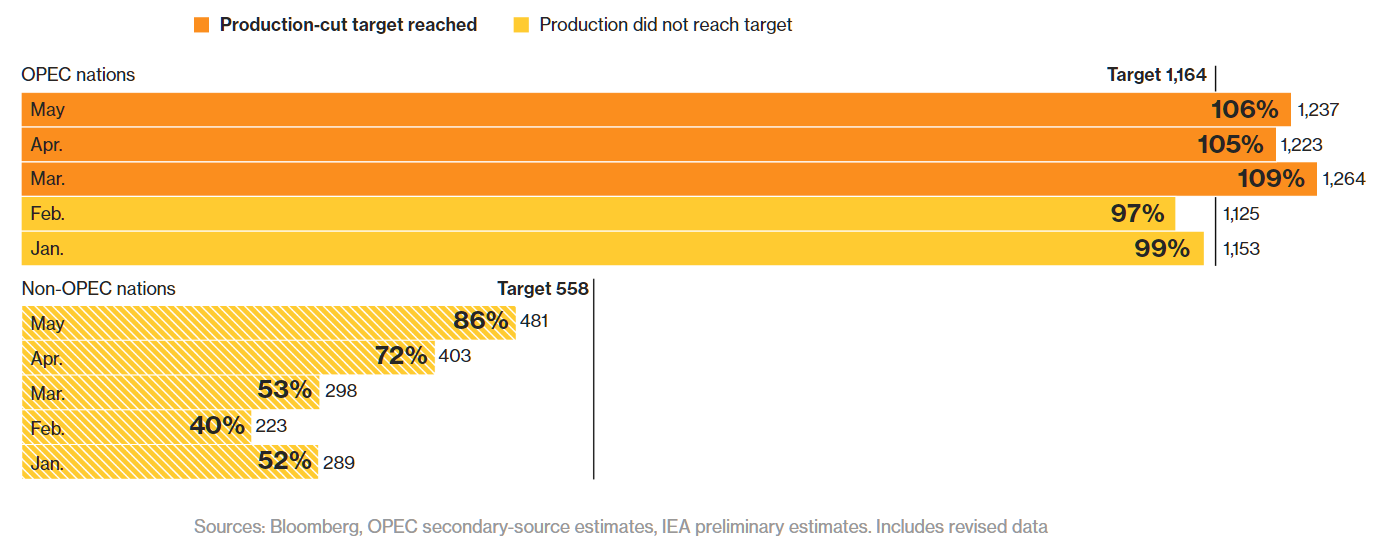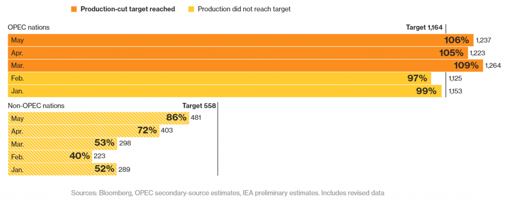 Opec extended production cuts that began in January 2017 for another nine months beyond June 2017. According to Bloomberg on June 19, OPEC members are close to achieving their 1.8 million b/d reduction target.