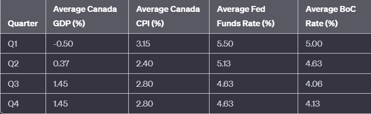 - Commodity Prices: Oil prices are expected to rise toward $85.00/b in 2024 and could easily top that level if the conflict between Israel and Hamas expands to include other Middle Eastern countries. An uptick in the global commodity market could bolster the demand for Canadian crude and other resources, contributing to the bearish sentiment for the USDCAD.