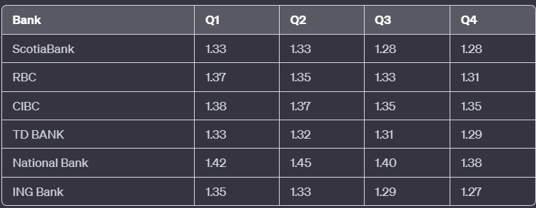 - Mid to Late Year Reversal: The landscape shifts as we progress into Q2 and beyond. The consensus forecast dips below the moving averages, indicating a potential weakening of USDCAD. By Q4, the forecast falls to 1.3200, significantly lower than the 200-day MA, suggesting a bearish outlook.
