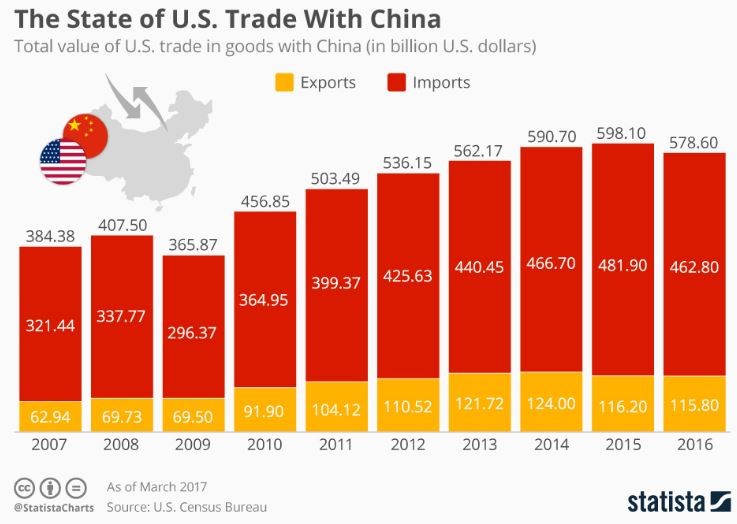 In Chapter 2 of the Art of the Deal, President Trump wrote “the best thing you can do is deal from strength and leverage is the biggest strength you have. Leverage is something the other guy wants or has to have or best of all, can’t do without.” The US has leverage. Its trade deficit with China in 2016 was $347.0 billion.