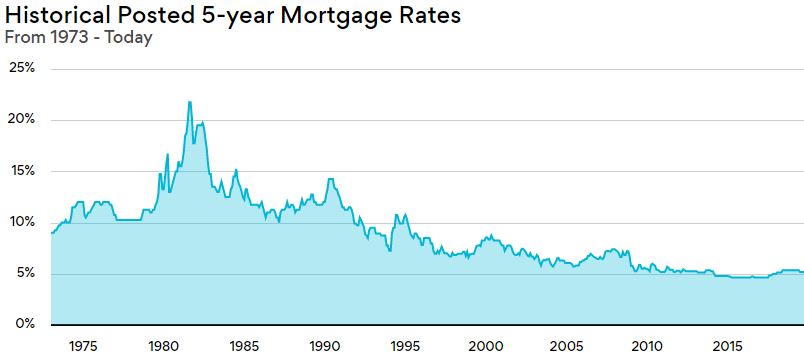 By 1975, Canadian inflation was over 10%, and the Liberal government of Pierre Trudeau announced an anti-inflation program, in part to combat union wage increase demands of around 20%. The program failed. Bank of Canada Governor Gerald Bouey progressed the Bank rate to a peak of 20.0% in June 1981. The average five-year mortgage rate soared to 21.6%. It took until April 2003 for the Bank rate to get below 5.0%. US interest rates and inflation followed a similar trajectory.