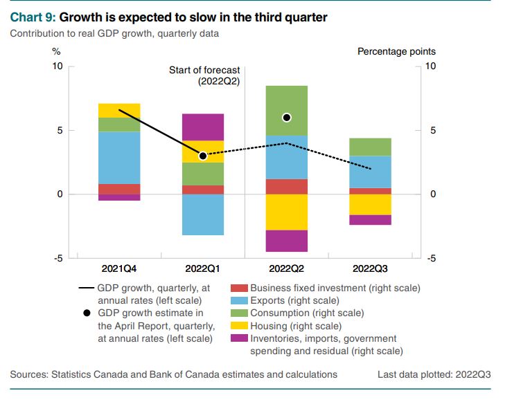 The Bank of Canada expects domestic growth to slow to 3.5% in 2022 and then fall sharply to 0.3% in 2023. The slowdown is due to the fading impact from the easing pandemic restrictions, consumers dealing with high inflation, and rising interest rates.