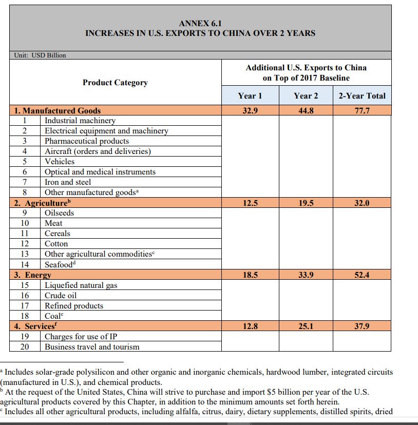 China agreed to import an average of $40.0 billion of US food, agricultural, and seafood products to the tune of $80.0 billion over the next two years. China also agreed to implement a transparent, predictable, efficient, science- and risk-based regulatory process for the evaluation and authorization of products of agricultural biotechnology.