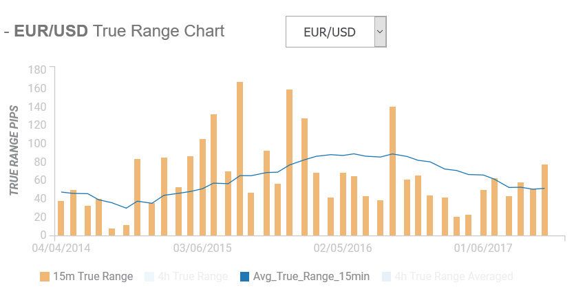 The scale on the left represents the number of EURUSD points (20 is equal to 0.0020) that EURUSD moved, either up or down.  The Orange bars show the 15-minute volatility while the Blue line is the normal 15-minute volatility.