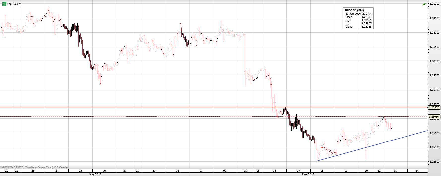 The slide in WTI combined with US dollar demand on risk aversion sentiment and bullish intraday technicals have propelled USDCAD through resistance at 1.2780 and opened the door to further gains to 1.2835. Canadian CPI data is released at the end of the week. Bank of Canada Governor, Stephen Poloz will be delivering a speech on Wednesday evening in the Yukon titled “The Canadian Economy : a progress report”. It will be followed by a press conference. This speech may be completely overshadowed by the FOMC statement and economic projections.