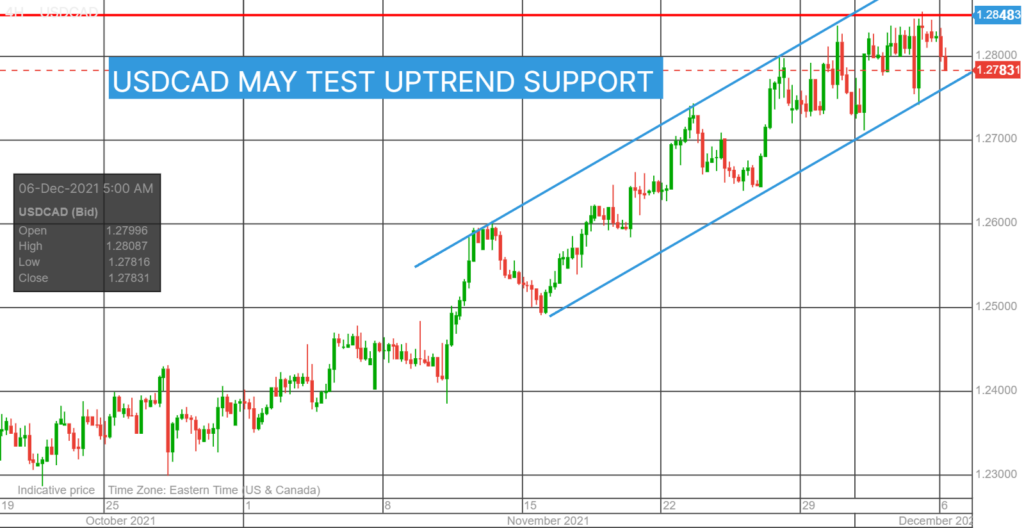 Technical view: The USDCAD technicals are bullish but the base of the uptrend channel from November 16 may get tested in the next few days. USDCAD tried and failed many attempts to break above 1.2750-60 area resistance last week, suggesting this week should see a probe of support. A hawkish BoC meeting may be the catalyst for a downside break, which might extend losses to 1.2575.