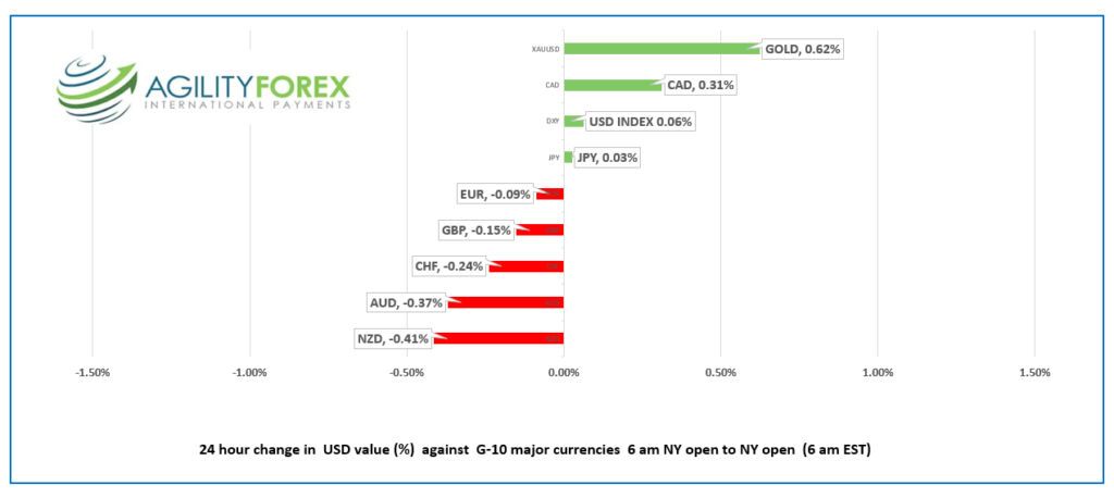 Asia equity indexes followed Wall Street’s lead and closed with losses. European traders were more optimistic, and the major indexes are higher with the UK FTSE up 0.90%. Gold prices inched lower, oil prices are higher, and US 10-year yields are 1.385%