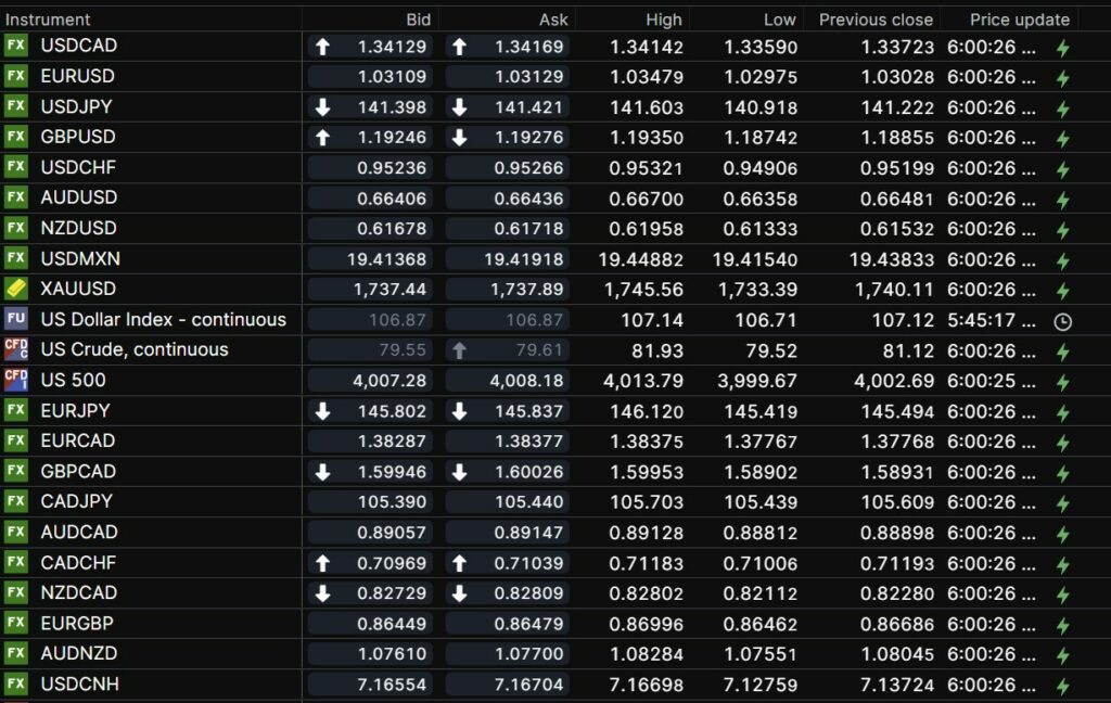 FX open, high, low, previous close as of 6:00 am ET