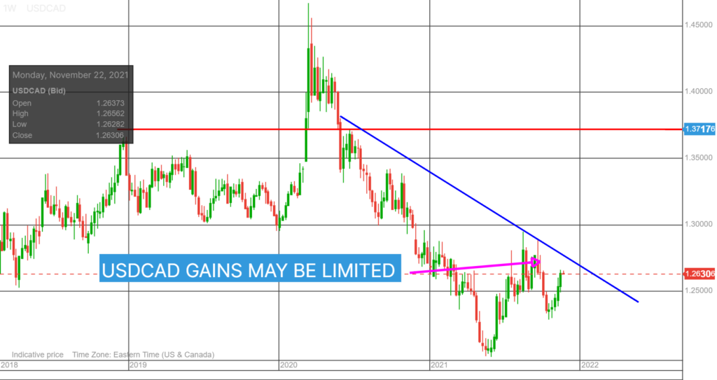 USDCAD gains are also fueled by the shift to modestly more hawkish rhetoric by FOMC members. Friday, Fed Vice Chair Richard Clarida suggested that it may be appropriate to increase the speed of tapering. Fed Governor Christopher Waller seems to agree. He said that inflation may stick around for a while which is affecting his expectations about the “level of monetary policy accommodation that is needed.”