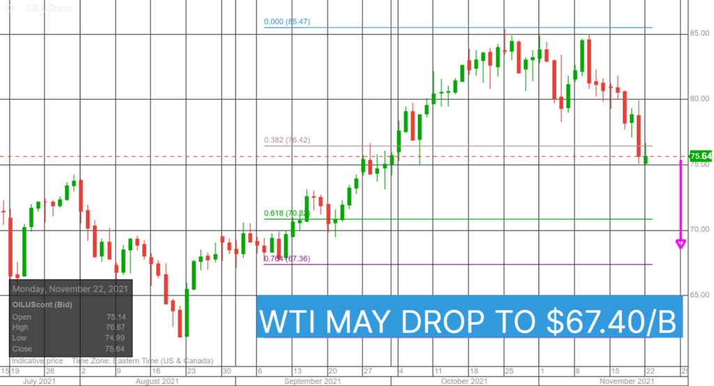 Overnight, oil extended losses with WTI falling to $75.05/barrel from $76.67, before rebounding to $76.07/b. The intraday WTI technicals are bearish with the break below $76.42 suggesting further losses to $67.40.