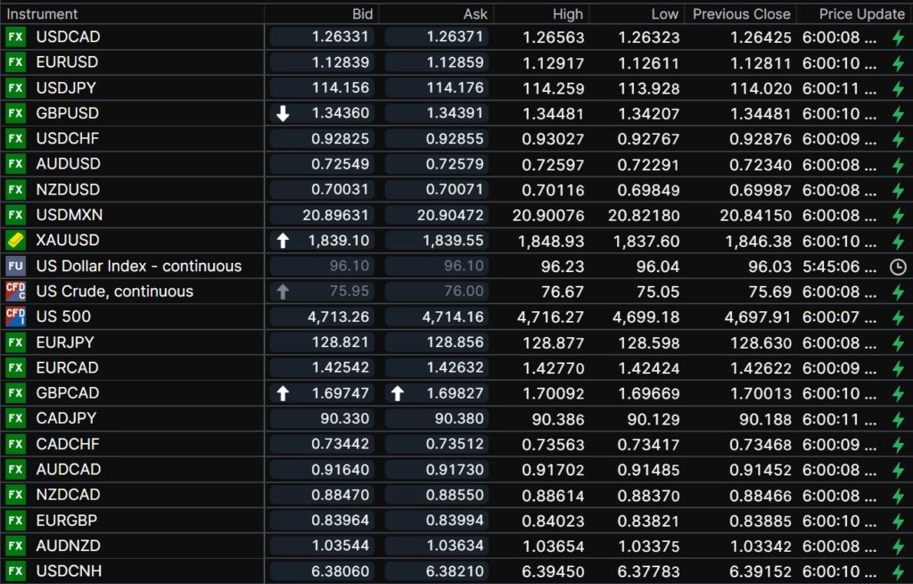 FX open, high, low, previous close as of 6:00 am ET