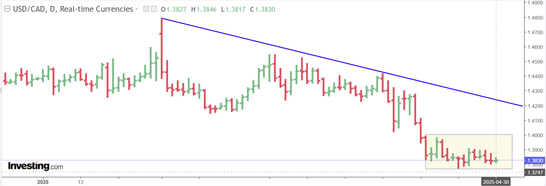 Kiwi is bouncing between two-week support in the 0.5920 area and a slight negative downtrend while below 0.5970. Prices were weighed down by a weak Business Confidence survey, which fell 9 points to 49 in April. ANZ Bank economists expect lower economic growth and additional rate cuts. On the plus side, prices were supported by hopes that Trump tariffs get rolled back, somewhat.