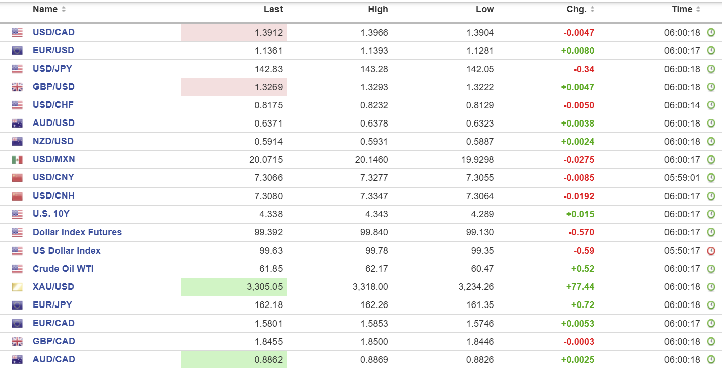 European bourses are in negative territory but far better than they were earlier. The German DAX is down 0.26% while the French CAC 40 is off 0.39%. S&P 500 futures have gotten weaker since the NY open and they are down 0.84%. The 10-year Treasury yield is 4.34% while gold (XAUUSD) made a fresh all-time high at 3318.00.