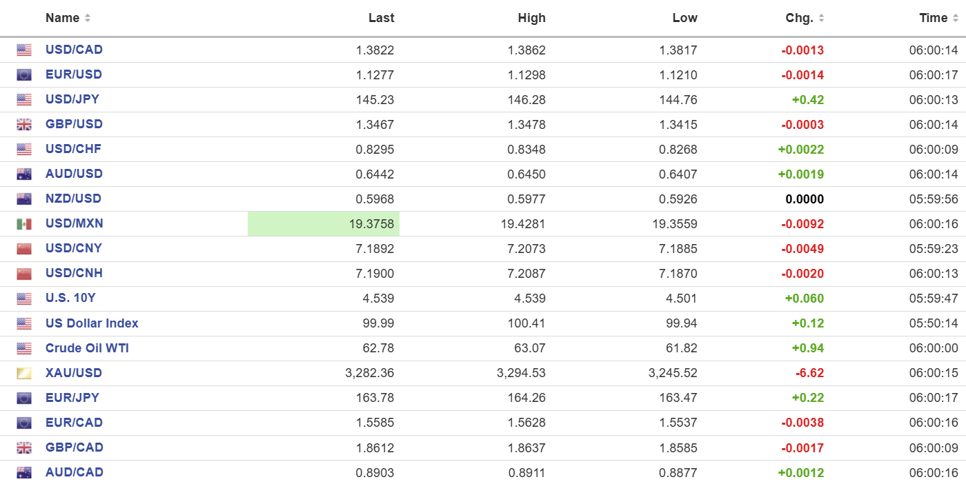 FX high, low, open (as of 6:00 am ET)