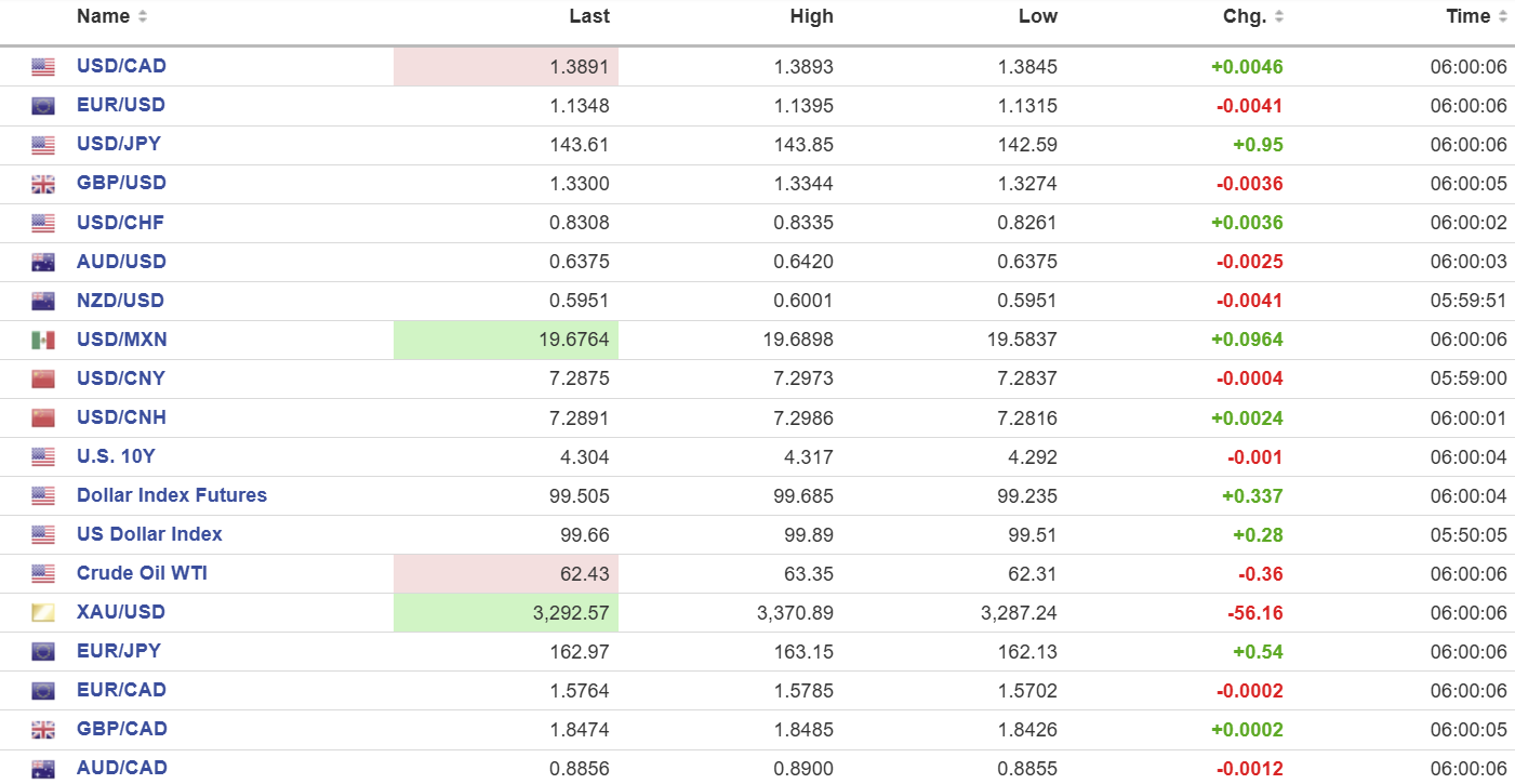 European bourses are higher. The French CAC 40 index is up 0.52% while the German Dax has climbed 0.67%. The UK FTSE 100 index has gained 0.15%, S&P 500 futures gave up earlier gains and are down 0.19%. The US 10-year Treasury yield ticked down to 4.272% while safe-haven trade unwinding knocked gold (XAUUSD) down to 3300.25. The CBOE VIX index is at 26.38, its lowest point for the week.