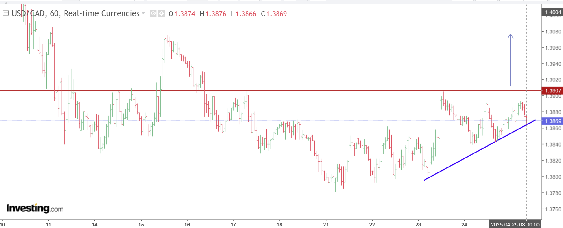 USDCAD rallied alongside broad U.S. dollar strength, driven by easing tensions in the U.S.–China tariff dispute. But Trump’s tariffs have amplified U.S. recession risks, pushing the odds of a Fed rate cut at the June 18 meeting to 61.7%.