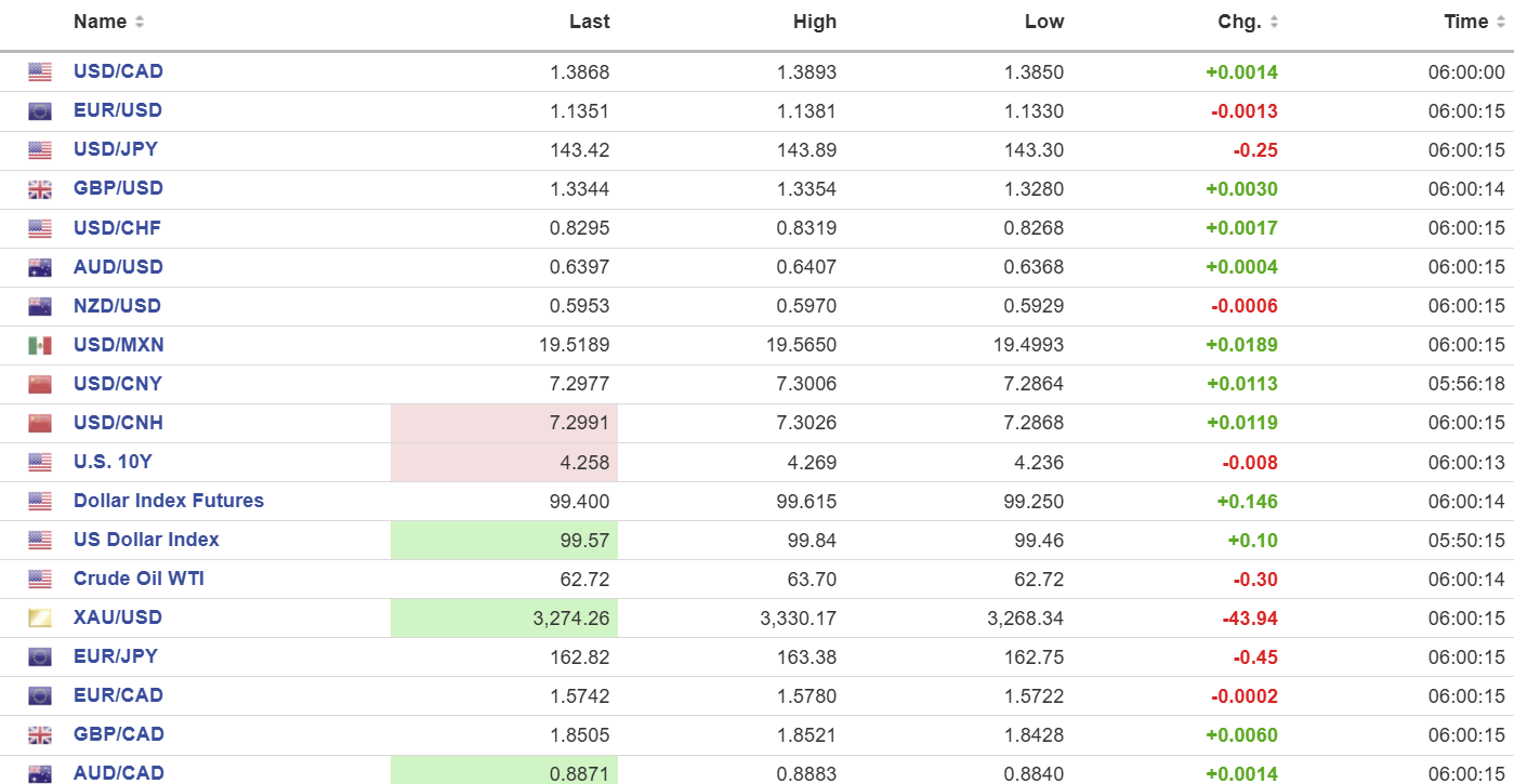 European bourses opened in positive territory and managed to hang on to most of the gains. The German Dax is up 0.62% while the French CAC 40 index has gained 0.68%. The UK FTSE 100 is the laggard, rising just 0.34% as of 6:30 am. S&P 500 futures are modestly lower, down 0.15%, while the US 10-year Treasury yield has risen 0.4% to 4.28%. Gold (XAUSUD) slumped to 3268.34 from 3330.17 before rising back to 3289.00 in NY.