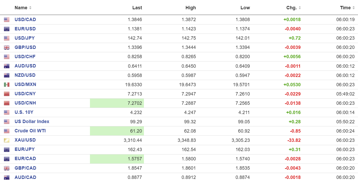 Australia’s ASX 200 surged 0.92% on the back of higher commodity prices, including uranium stocks. Japanese markets were closed. European bourses opened in positive territory and then traded sideways. The German DAX rose 0.66% while the French CAC 40 index fell 0.14%. The UK FTSE 100 is down 0.20%. S&P 500 futures are down 0.28% and the US 10-year Treasury yield sits at 4.21%. Gold (XAUUSD) drifted lower and is trading at 3312.00 in NY.