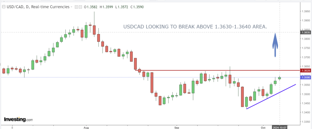 USDCAD rallied Friday as Friday’s US jobs report underscored the economic disparities between the Canadian and US economies. The US economy is motoring ahead despite a few speed bumps while the Canadian economy is crashing into pot-holes. Bank of Canada Governor Tiff Macklem’s “made in Canada” interest rate policy is going to be put to the test. Canada’s economic growth is fueled by government spending and the only sector adding new jobs is the government. Inflation is at the BoC target and expected to fall further.  All of that points to the BoC cutting rates by 50 bps on October 23.  If so, USDCAD will test 1.3750.