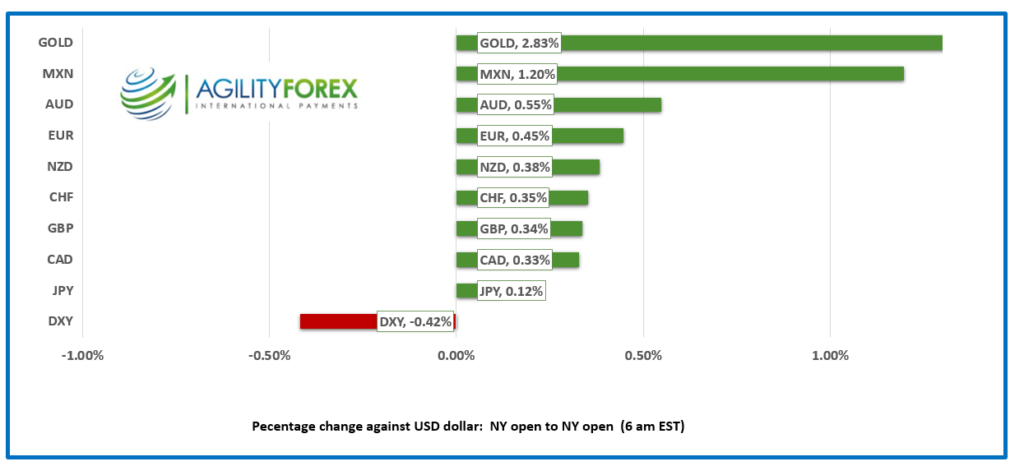 Asian equity indexes closed with gains across the board, led by a 2.30% rise in the Hong Kong Hang Seng index. Japan’s Nikkei 225 index rose 0.41% while Australia’s ASX 200 gained 0.35%. European bourses are well into the green. The French CAC 40 index and UK FTSE 100 indexes are up 0.84%, and S&P 500 futures are up 0.37%. Gold (XAUUSD) surged 2.83% from yesterday’s opening level.