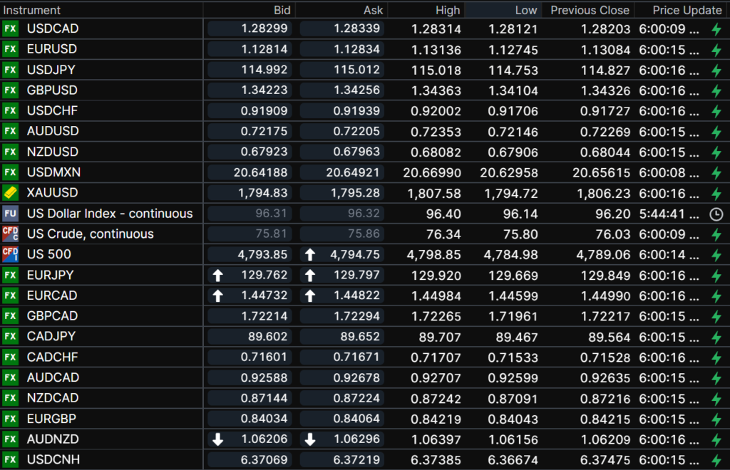 FX open, high, low, previous close as of 6:00 am ET