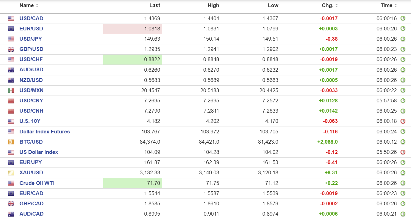 The market relief (fatigue) around tariffs helped Wall Street close with mild gains. Asian equity indexes followed suit, led by a 1.04% rise in Australia’s ASX 200 and a 0.11% gain in Japan’s Topix. European equity indexes are higher, with the German Dax and French CAC 40 (+1.36% and 0.99%, respectively) leading the charge higher. S&P 500 futures are flat, while the 10-year Treasury yield dipped to 4.17% from 4.21%. Gold (XAUUSD) consolidated its safe-haven gains in a 3120.18–3149.03 range.