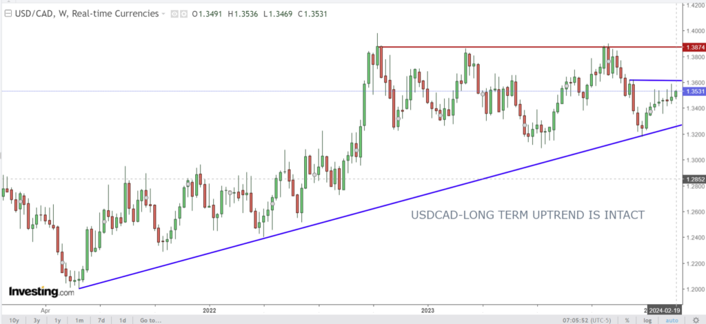 Longer term, the USDCAD uptrend from April 2021 is intact while prices are above 1.3250, a level guarded by the uptrend line from November 2023 at 1.3360. A break above 1.3620 targets 1.3880 while a move below 1.3360 suggests a retest of 1.3360.