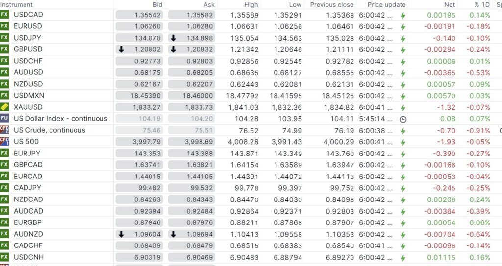 FX open, high, low, previous close as of 6:00 am ET