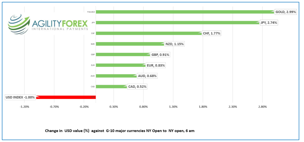 - US dollar plunges on repricing of Fed terminal rate.