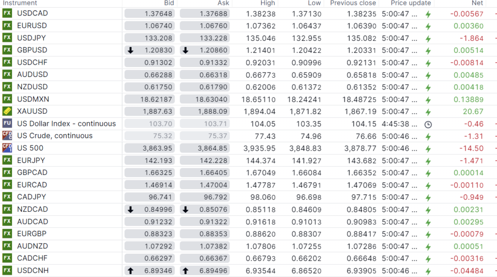 FX open, high, low, previous close as of 6:00 am ET