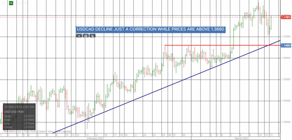 The stronger than expected Canadian employment report (job gains 21,000) has been forgotten in the wake of the collapse of Silicon Valley Bank and the US 10-year Treasury yield. Sharply narrowing CAD/US interest rate spreads fueled USDCAD losses overnight while falling S&P 500 futures are limiting downside moves.