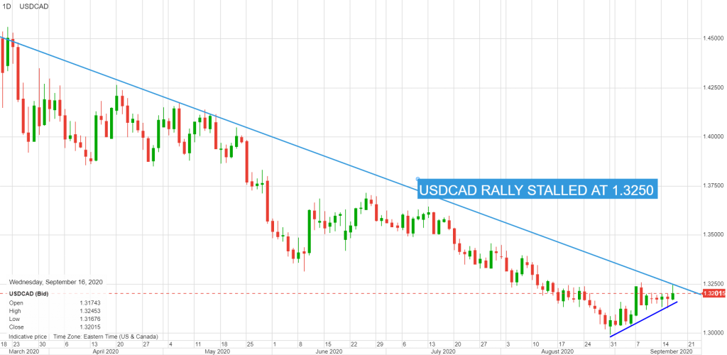 USDCAD rallied due to broad US dollar strength, but the rally failed to penetrate downtrend resistance at 1.3250.  Prices have since retreated, but  US dollar moves vs the majors, particularly EURUSD, determine direction.