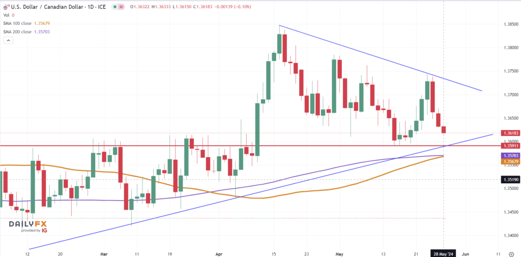 USDCAD slipped alongside general bearish US dollar sentiment and renewed hopes for an earlier than expected Fed rate cut. That is partially offsetting risks of renewed USDCAD demand from a Bank of Canada rate cut on June 5.