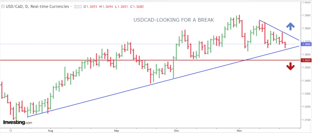The intraday USDCAD are bearish below 1.3705 which guards the November 11 downtrend line at 1.3760. Traders are looking for prices to chew through support in the 1.3630-1.3650 area to extend losses to 1.3550. A move below 1.3550 targets 1.3370. A topside break above 1.3710 targets 1.3670.