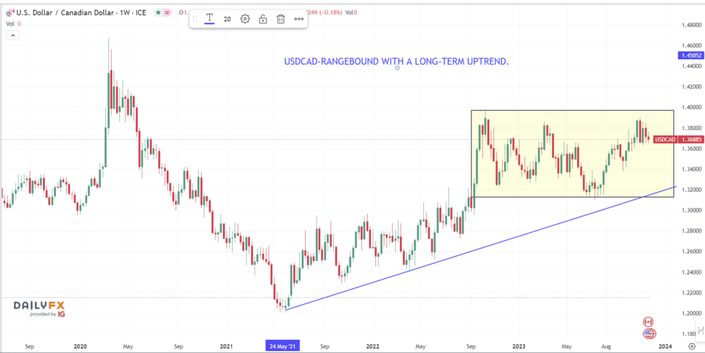 Longer term, the monthly chart shows a bullish bias from May 2021 with prices consolidating gains from 1.2020 in a 1.3100-1.4000 range. The fact that USDCAD is close to the top of the band offers some scope for further losses.