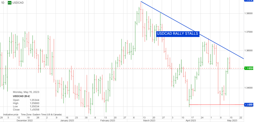 Canada’s April inflation data is released Tuesday. Headline CPI is expected to fall to 4.1% from 4.3% y/y while the more important Core CPI drops to 3.9% from 4.3%. Hotter than expected readings will cause speculation that the BoC will be forced off the fence and raise interest rates.