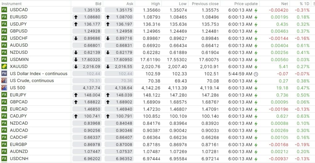 FX open, high, low, previous close as of 6:00 am ET
