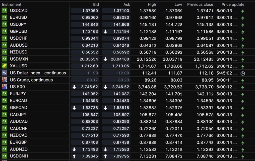 FX open, high, low, previous close as of 6:00 am ET