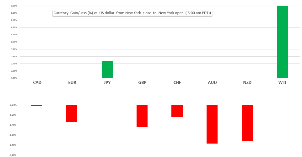 Change in currency value against the US dollar from NY close to NY open (6:00 am EST)